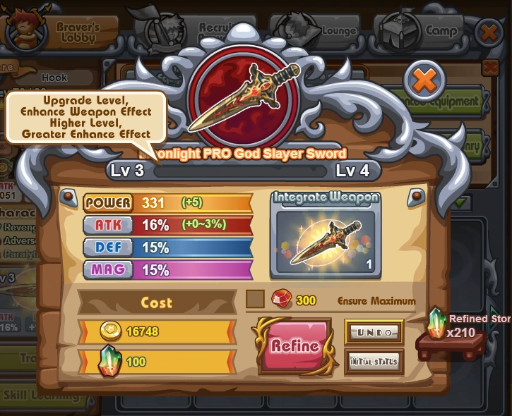 - Click on Enhance Equipment to open up the Weapon Enhancement Interface.